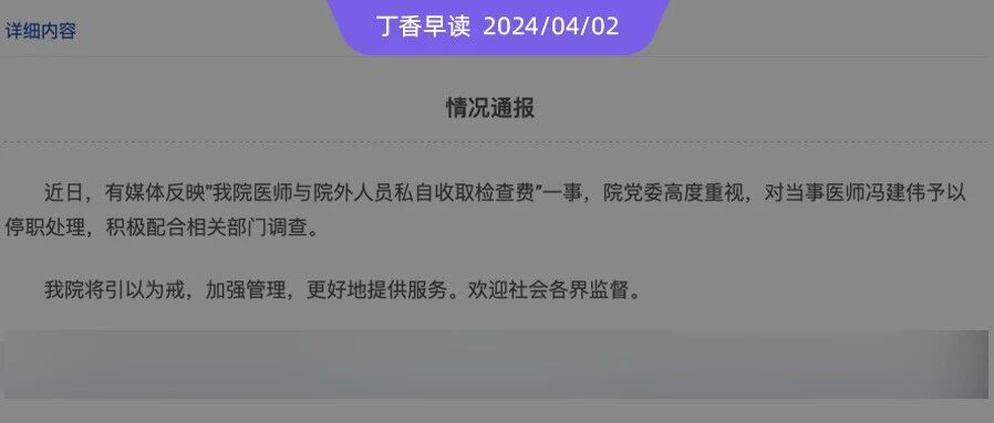 | 医院通报「医生私收检查费」:涉事医生已停职 | 查看 | 2024-04-02 09:01:47 | 28304 | 3 | 2024-04-02 10:06:32 | 丁香园 | |
