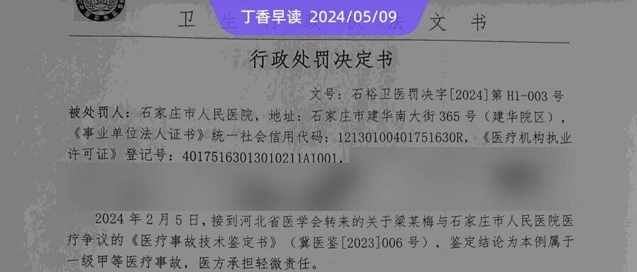 | 某三甲医院发生一级甲等医疗事故、病历书写不规范,被罚款 10000 元 | 查看 | 2024-05-09 09:02:39 | 29908 | 3 | 2024-05-09 10:06:54 | 丁香园 |